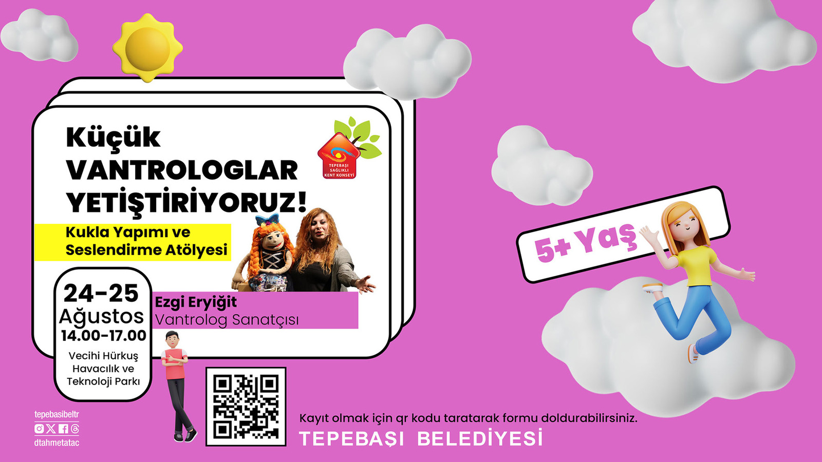 5 yaş üzeri çocuklar için de Tepebaşı Sağlıklı Kent Konseyi iş birliği ile Küçük Vantrologlar Yetiştiriyoruz sloganıyla Kukla Yapımı ve Seslendirme Atölyesi yapılacak. Vecihi Hürkuş Havacılık ve Teknoloji Parkı’nda gerçekleştirilecek olan atölye, 24-25 Ağustos’ta 14.00-17.00 saatleri arasında Vantrolog Sanatçısı Ezgi Eryiğit eğitmenliğinde düzenlenecek.