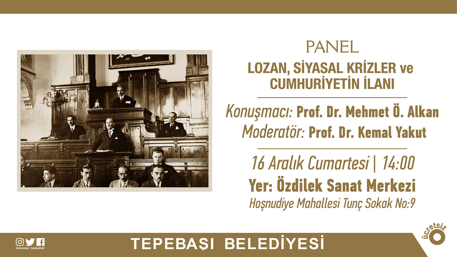 Tepebaşı Belediyesi tarafından ‘Lozan, Siyasal Krizler ve Cumhuriyetin İlanı’ konulu panel düzenlenecek.