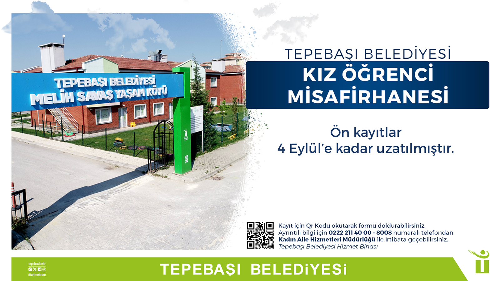 Tepebaşı Belediyesi Melih Savaş Yaşam Köyü’nde hazırlanan ve 2023-2024 eğitim öğretim yılında açılacak olan Kız Öğrenci Misafirhanesi için ön kayıt başvuru tarihi uzatıldı.