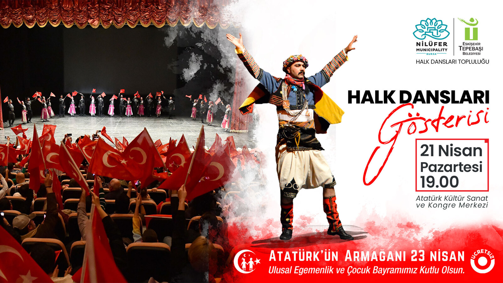 Tepebaşı Belediyesi ve Bursa Nilüfer Belediyesi Halk Dansları Topluluğu muhteşem bir gösteriyle izleyiciler ile buluşacak. 23 Nisan Ulusal Egemenlik ve Çocuk Bayramı dolayısıyla düzenlenecek gösteri Atatürk Kültür Sanat ve Kongre Merkezi’nde ücretsiz olarak gerçekleşecek. Gösteri 21 Nisan pazartesi günü saat 19.00’da başlayacak.