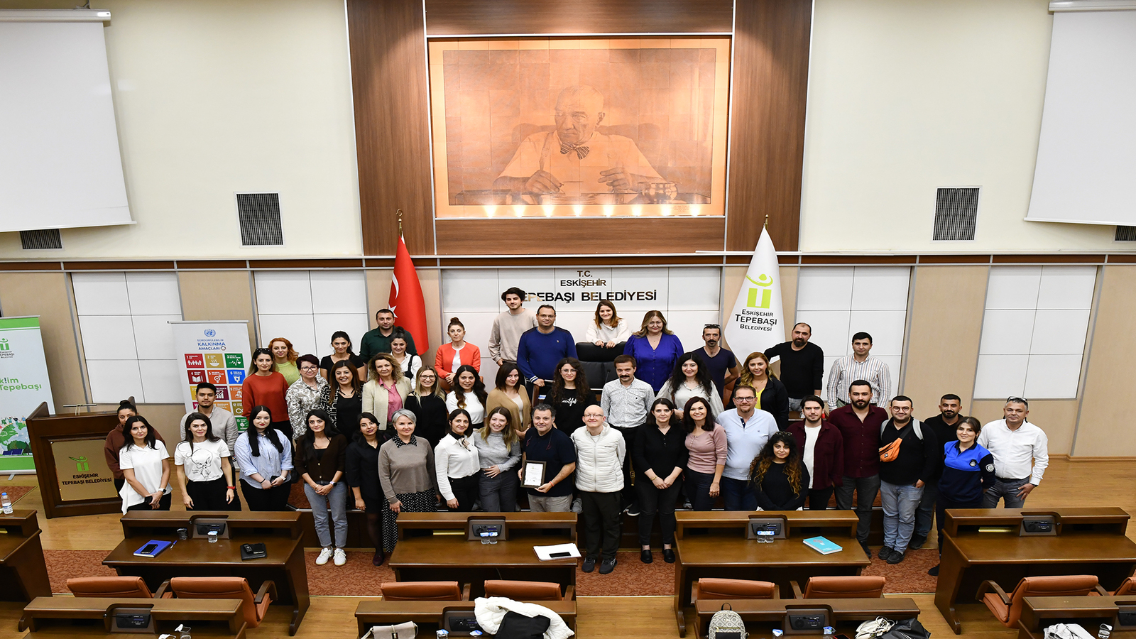 Bu kapsamda Tepebaşı Belediyesi İklim Değişikliği Müdürlüğüne bağlı çalışan Sürdürülebilirlik Merkezi aracılığıyla personele ‘Sürdürülebilirlik İletişimi’ eğitimi düzenlendi. Belediye faaliyetlerini küresel amaçlarla uyumlaştırmak ve bu çerçevede çalışmalar yapılmasını kolaylaştırmak amacıyla düzenlenen eğitim belediye Meclis Salonunda gerçekleşti.