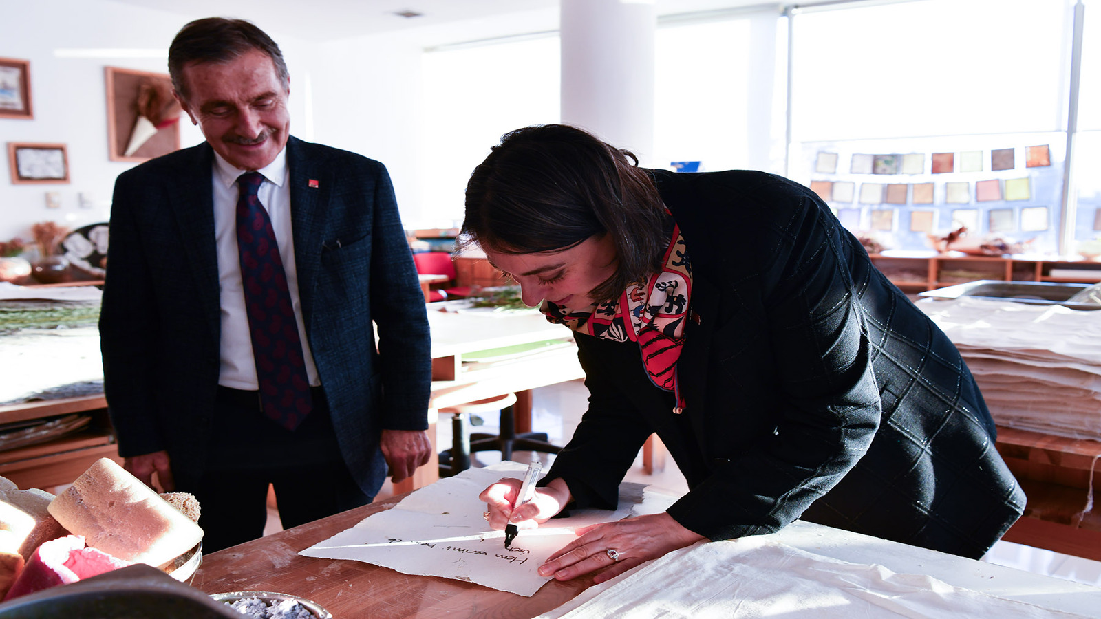 Misafirperverliğinden dolayı Başkan Ataç’a teşekkürlerini ileten Sinem Dedetaş da, “Eskişehir’de ve Tepebaşı’nda bulunmaktan dolayı çok memnunum. Hem verimli hem de üretim ve sanat içerikli bir belediye binasında bulunmaktan dolayı çok mutluyum. Burayı gördükten sonra ufkumuz açıldı. Ahmet Başkanım başta olmak üzere emeği geçen herkese çok teşekkür ediyorum. Tepebaşı’ndan Üsküdar’a bir ufuk açıldı” ifadelerini kullandı.