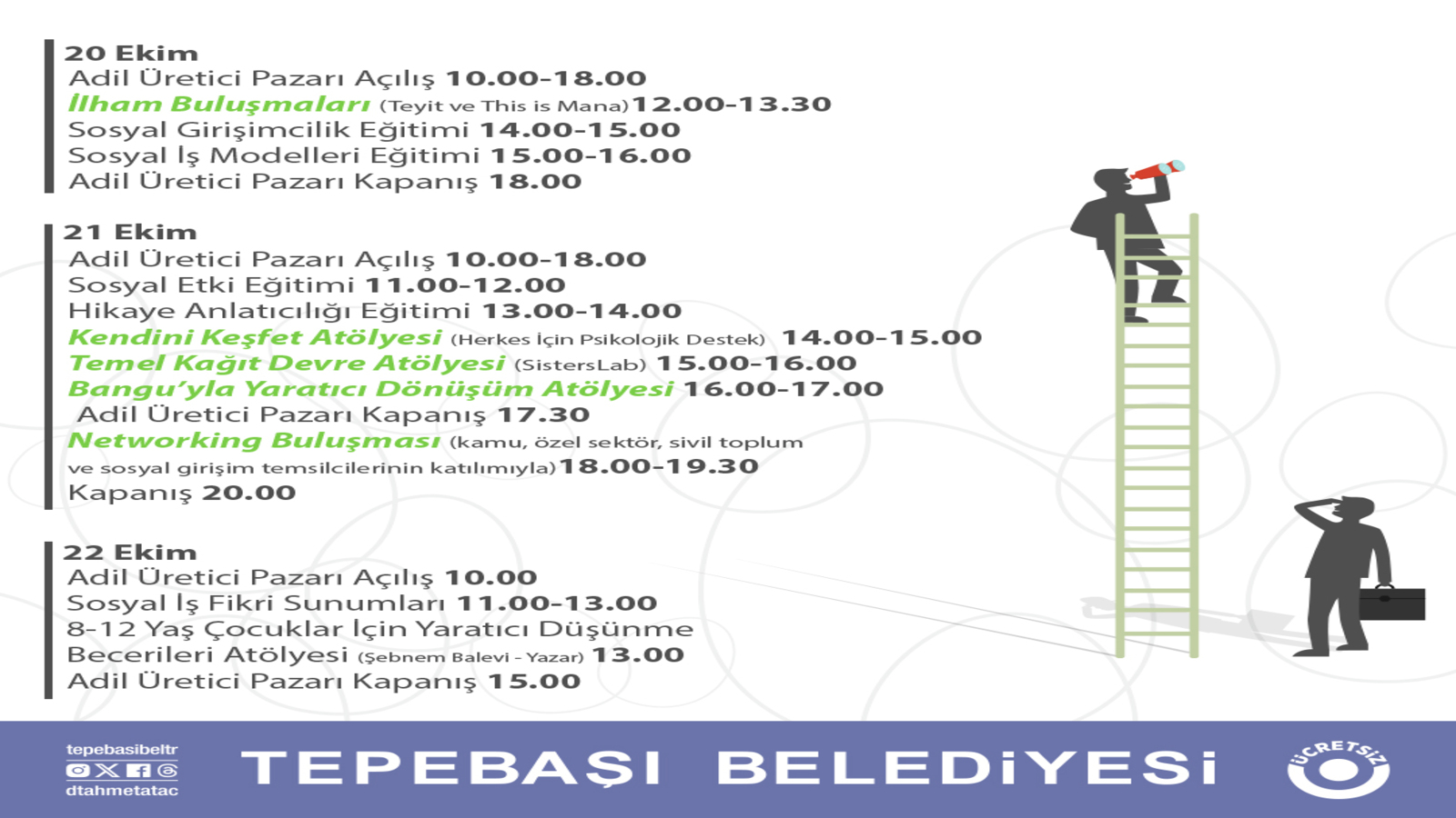 20-21 ve 22 Ekim tarihlerinde Vecihi Hürkuş Havacılık ve Teknoloji Parkı’nda gerçekleşecek festival gün boyu sürecek. 20 Ekim Cuma günü saat 10.00-18.00 arasında adil üretici pazarı, ilham buluşmaları, eğitimler katılımcılar ile buluşacak. 21 Ekim Cumartesi günü 10.00-20.00 saatleri arasında eğitimler, atölyeler ve networking buluşması gerçekleşecek. 22 Ekim Pazar günü 10.00-15.00 saatleri arasında atölye ve sunumlar düzenlenecek.