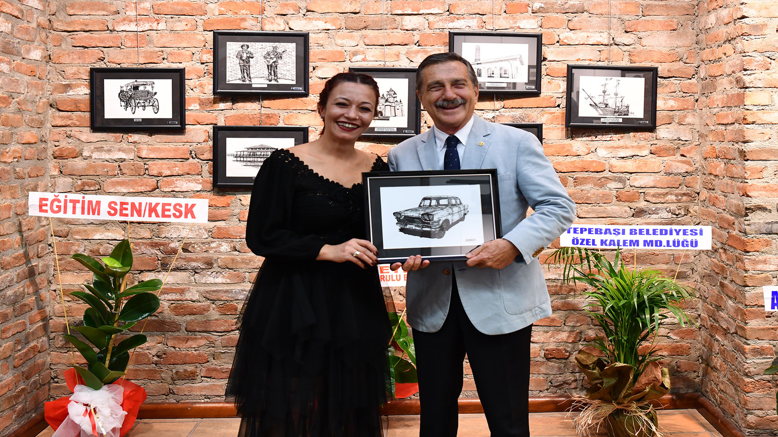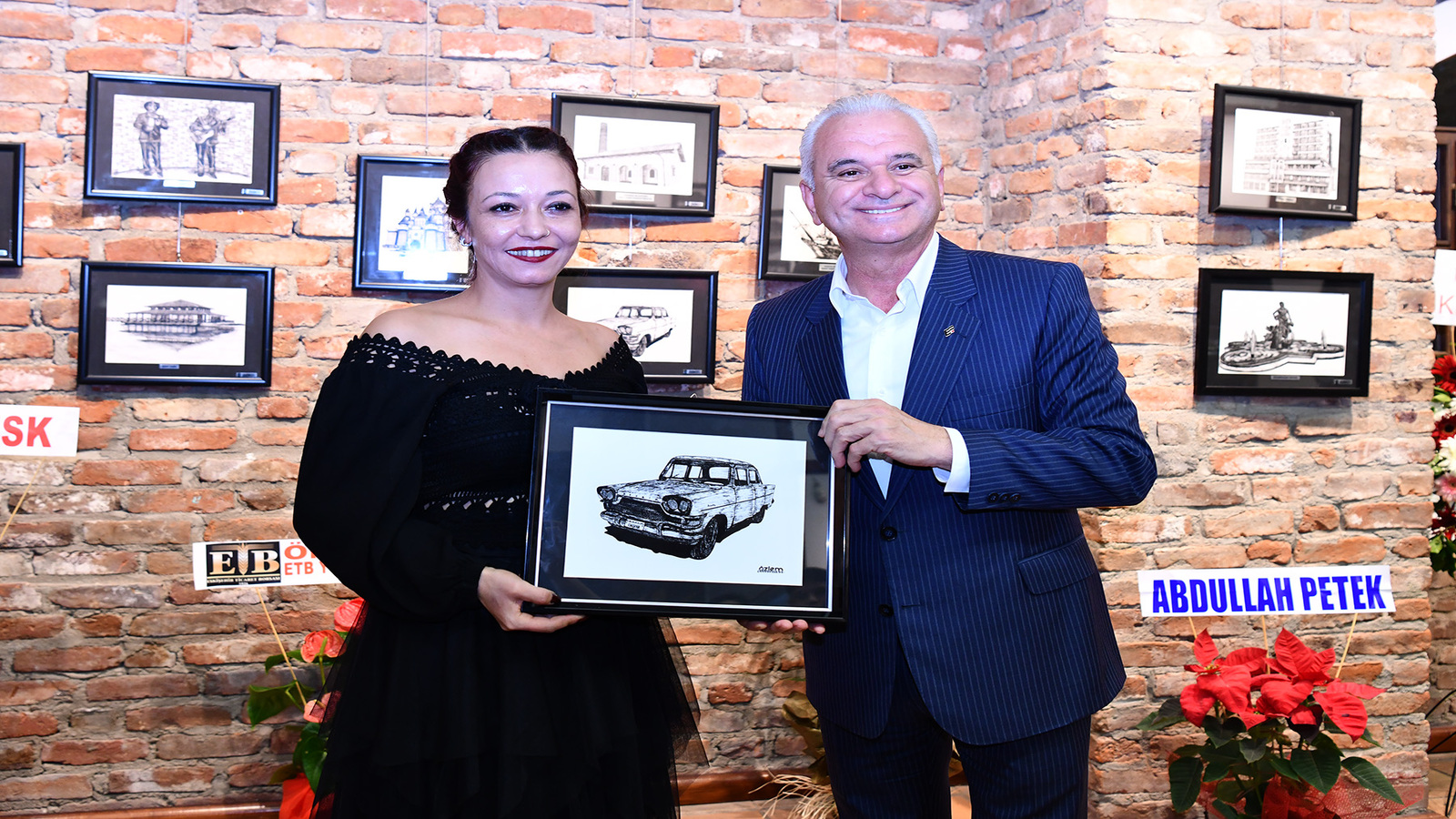 Duman da Başkan Ataç ve Güler’e devrim otomobilinin pilot kalemle yapmış olduğu resmi hediye etti.