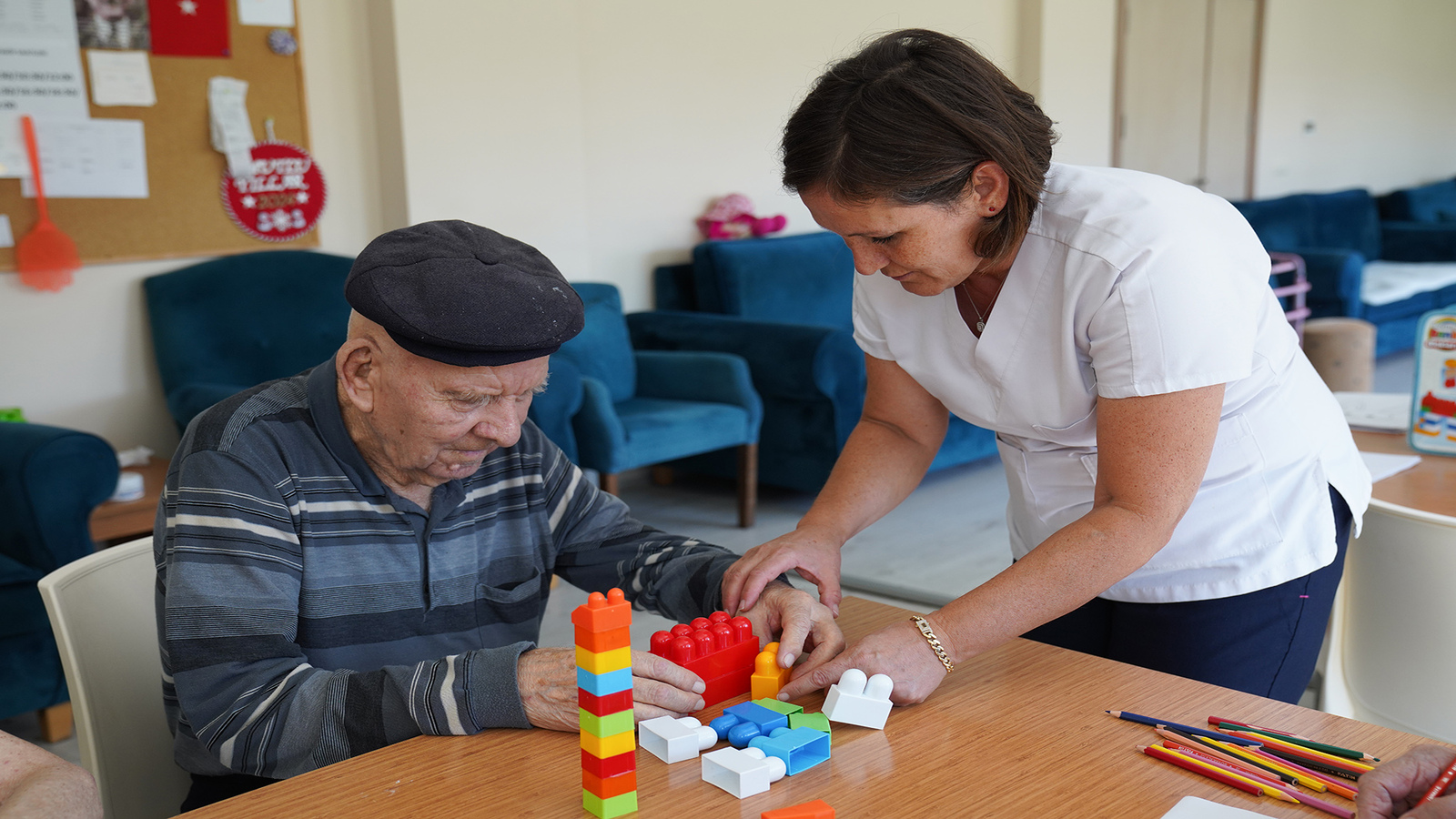 Merkez’de 1 doktor, 1 nöroloji uzmanı danışman doktor, 5 hemşire, 50 hasta bakım elemanı, 1 sosyal hizmet uzmanı, 1 diyetisyen, 1 psikolog, 1 fizyoterapist ve 15 temizlik çalışanı ile hizmet sunuyor.