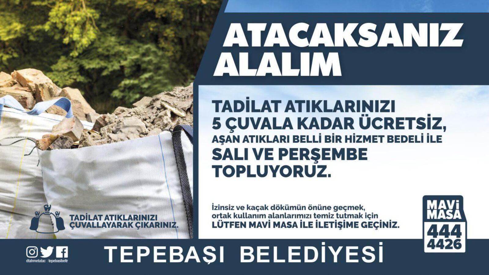 Tepebaşı Belediyesi ekipleri, vatandaşların bahçe ve budama atıklarından kül ve cüruf atıklarına, mobilya ve ev eşyası atıklarından tadilat atıklarına kadar her türlü atığı evlerinden teslim alıyor.