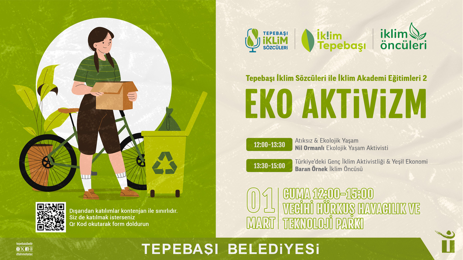 Son olarak Tepebaşı Belediyesi’nin “Tepebaşı İklim Sözcüleri” programı kapsamında, “Tepebaşı Belediyesi İklim Sözcüleri ile İklim Akademi Eğitimleri-2” düzenlenecek. Eğitim kapsamında “Eko Aktivizm” ele alınacak. Bu başlık altında; “Atıksız ve Ekolojik Yaşam” konusunda konuşmacı olarak Ekolojik Yaşam Aktivisti Nil Ormanlı ve “Türkiye’deki Genç İklim Aktivistliği Yeşil Ekonomi” hakkında ise konuşmacı olarak İklim Öncüsü Baran Örnek yer alacak. Eğitim, 1 Mart Cuma Günü 12.00-15.00 saatleri arasında Tepebaşı Belediyesi Vecihi Hürkuş Havacılık ve Teknoloji Parkı’nda gerçekleştirilecek.