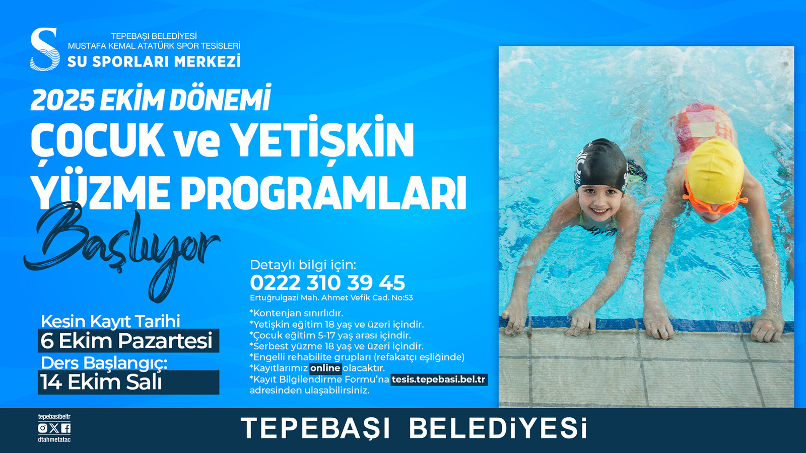 Tepebaşı Belediyesi Mustafa Kemal Atatürk Spor Tesisleri Su Sporları Merkezi’nde düzenlenecek olan 2025 Ekim dönemi çocuk ve yetişkin yüzme kursları için başvurular başlıyor.