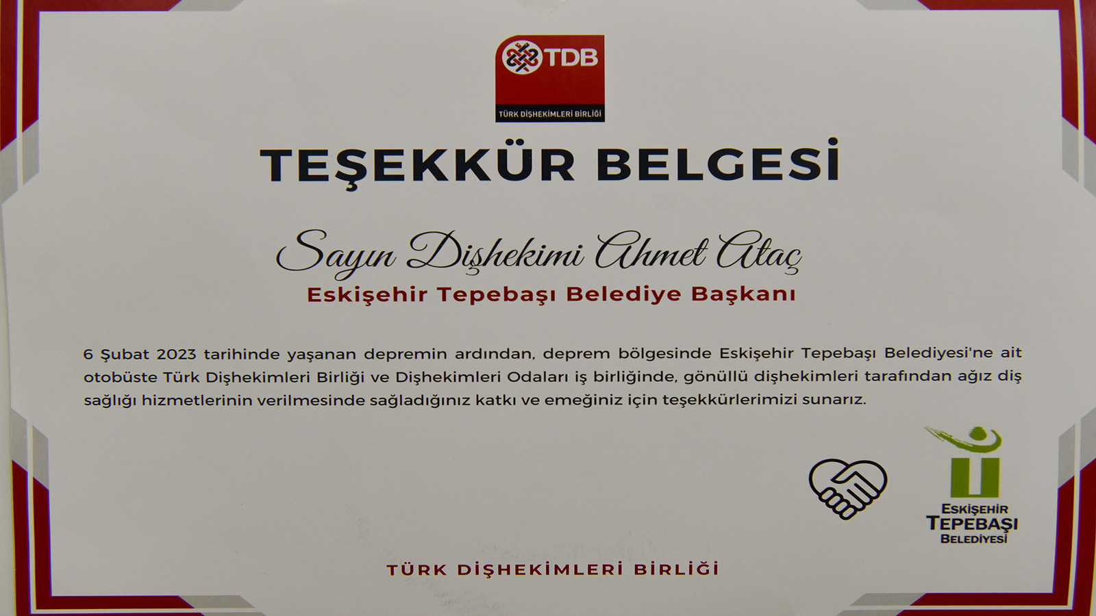 TÜRK DİŞHEKİMLERİ BİRLİĞİ'NDEN BAŞKAN ATAÇ'A TEŞEKKÜR