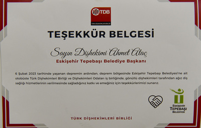 Tepebaşı Belediyesi öncülüğünde hazırlanan Mobil Diş Kliniği aracı ve verilen tüm desteklerden dolayı Türk Dişhekimleri Birliği Genel Başkanı Tarık İşmen, Tepebaşı Belediye Başkanı Ahmet Ataç’a ve ekiplere teşekkürlerini iletti. İşmen ilettiği teşekkür mektubunda, “6 Şubat’ta yaşanan depremle büyük bir yıkıma uğrayan bölge halkının ağız ve diş sağlığı hizmetlerine olan yoğun ihtiyaçları nedeniyle Türk Dişhekimleri Birliği ve Dişhekimler Odaları tarafından yapılan organizasyon ile 2 Mart 2023 tarihinden itibaren görevli diş hekimlerinin görev aldığı mobil klinik hizmetleri başlatılmıştır. Belediyeniz tarafından bu hizmetlere tahsis edilen ve klinik ortamına dönüştürülen otobüsle gönüllü meslektaşlarımızın verdiği hizmetin, başta bölge halkının ağız ve diş sağlığı olmak üzere yaşama sevinçlerine kattığı moral motivasyonun deprem korkularını nasıl umuda dönüştüğünü hep birlikte yaşayarak gördük. Deprem bölgesinde gönüllü diş hekimliği hizmetlerinin verilmesinde önemli rol alan Eskişehir Tepebaşı Belediyesi’ne şahsınızda teşekkür ve takdir duygularımızı sunuyorum” ifadelerine yer verildi.