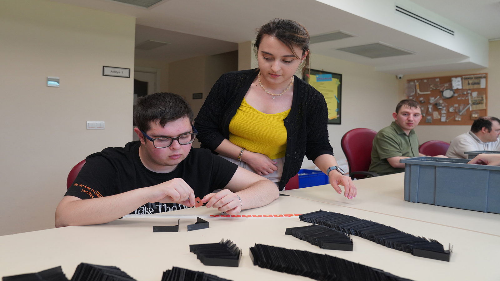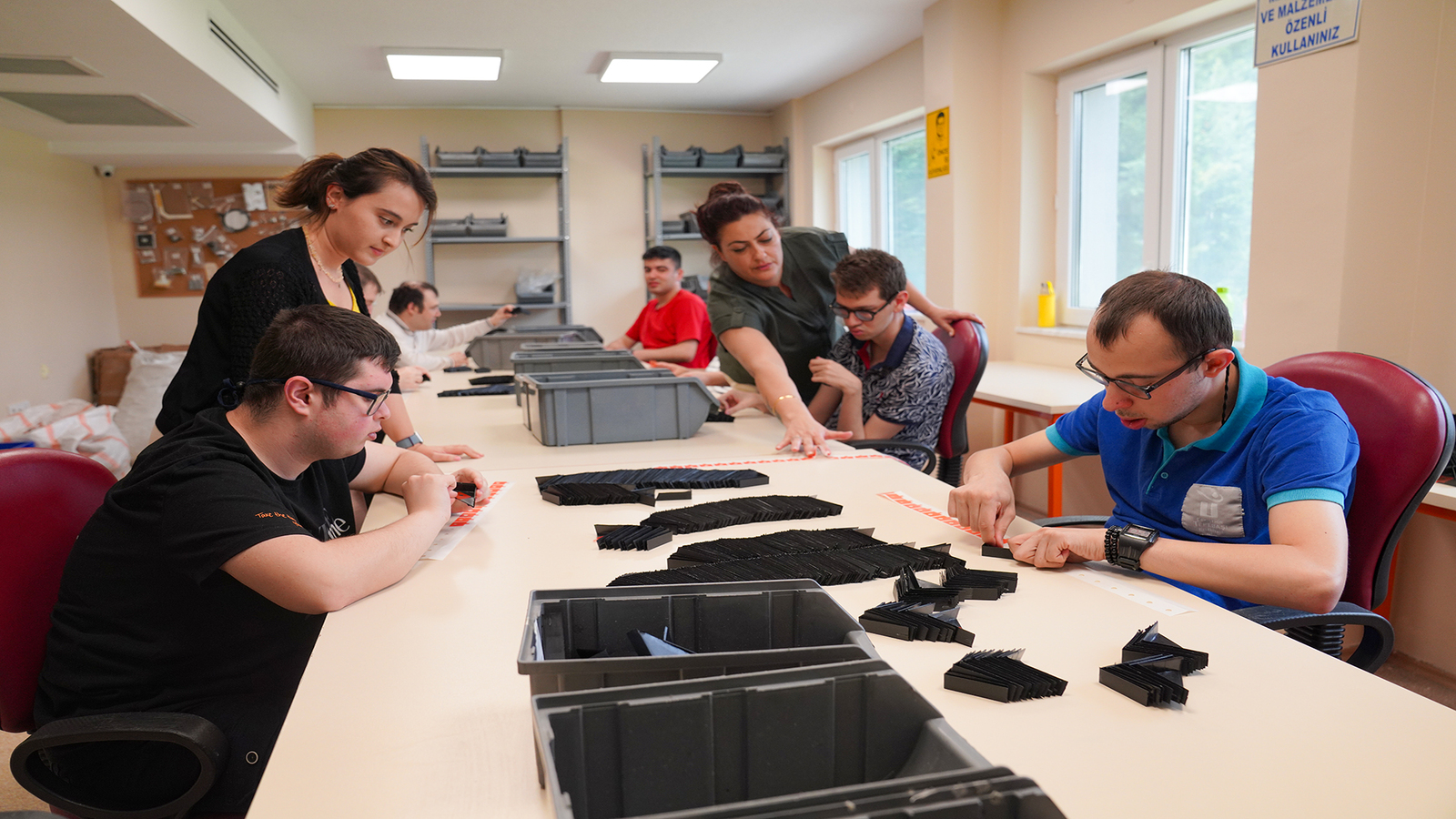 Montaj atölyelerinde çalışan özel bireyler de çalışmaktan mutlu olduklarını ifade ediyor.