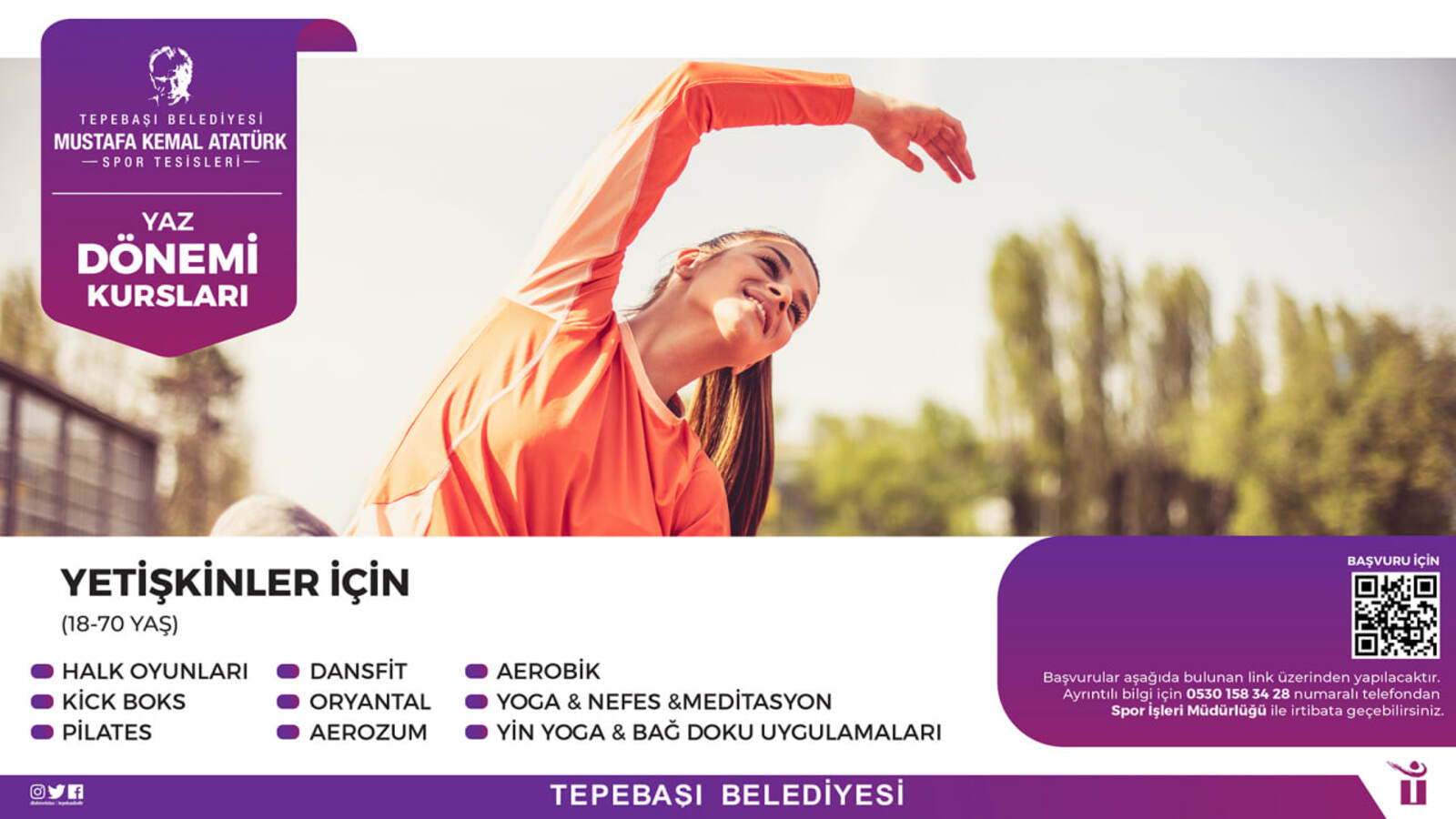 Tepebaşı Belediyesi'nin uluslararası Leed Sertifikalı yeşil bina özelliğine sahip Mustafa Kemal Atatürk Spor Tesisleri ve Su Sporları Merkezi’nde düzenlenecek olan çocuk, genç ve yetişkin yaz kursları için başvurular başlıyor. Çocuk ve gençler için hazırlanan kurs programları arasında aikido, teakwondo, taebo, modern dans ve halk dansları yer alıyor. Yetişkinler de ise halk oyunları, kick boks, pilates, dansfit, oryantal, aerozum, aerobik, yoga-nefes-meditasyon, yin yoga-bağ doku uygulamaları yer alıyor.