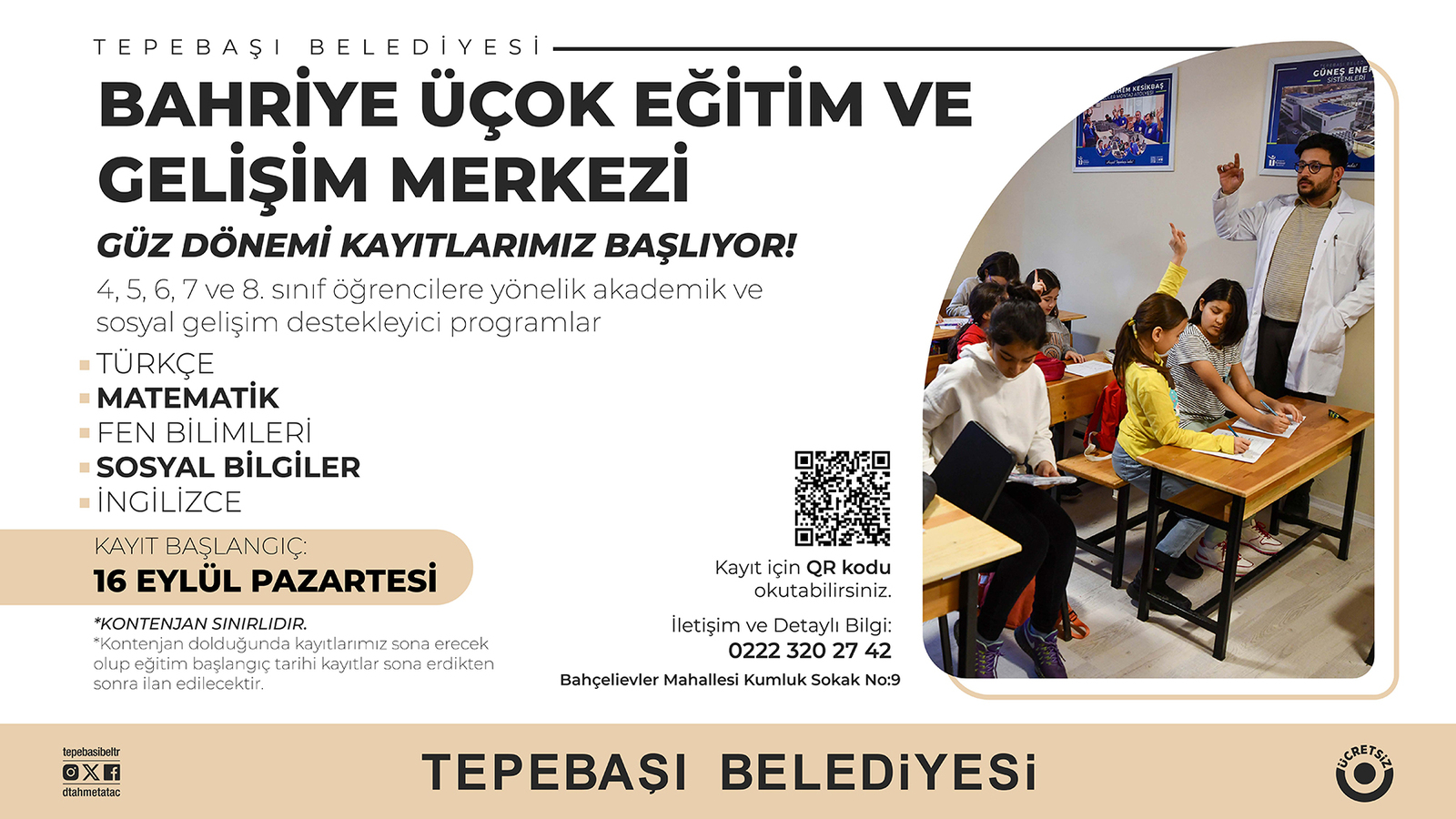 Tepebaşı Belediyesi Bahriye Üçok Eğitim ve Gelişim Merkezi için güz dönemi kayıtları başlıyor. Merkezde, öğrencilerin akademik ve sosyal gelişimini destekleyen programlar yer alıyor.