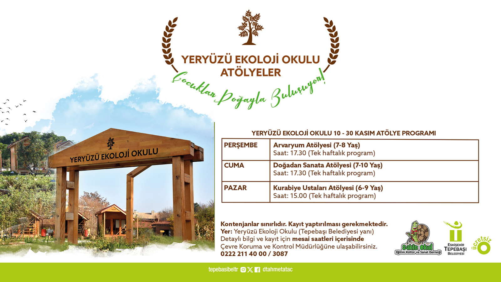 Tepebaşı Belediyesi ile Sakin Okul Eğitim Kültür ve Sanat Derneği iş birliğinde hayata geçirilen Yeryüzü Ekoloji Okulu’nda ücretsiz olarak gerçekleştirilen atölye çalışmaları kapsamında Kasım ayı programı başlıyor.