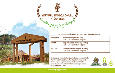Yeryüzü Ekoloji Okulu’nda 10-30 Kasım tarihleri arasında gerçekleşecek atölye çalışmaları arasında; arvaryum atölyesi (7-8 yaş), doğadan sanata atölyesi (7-10 yaş) ve kurabiye ustaları atölyesi (6-9 yaş) yer alıyor.