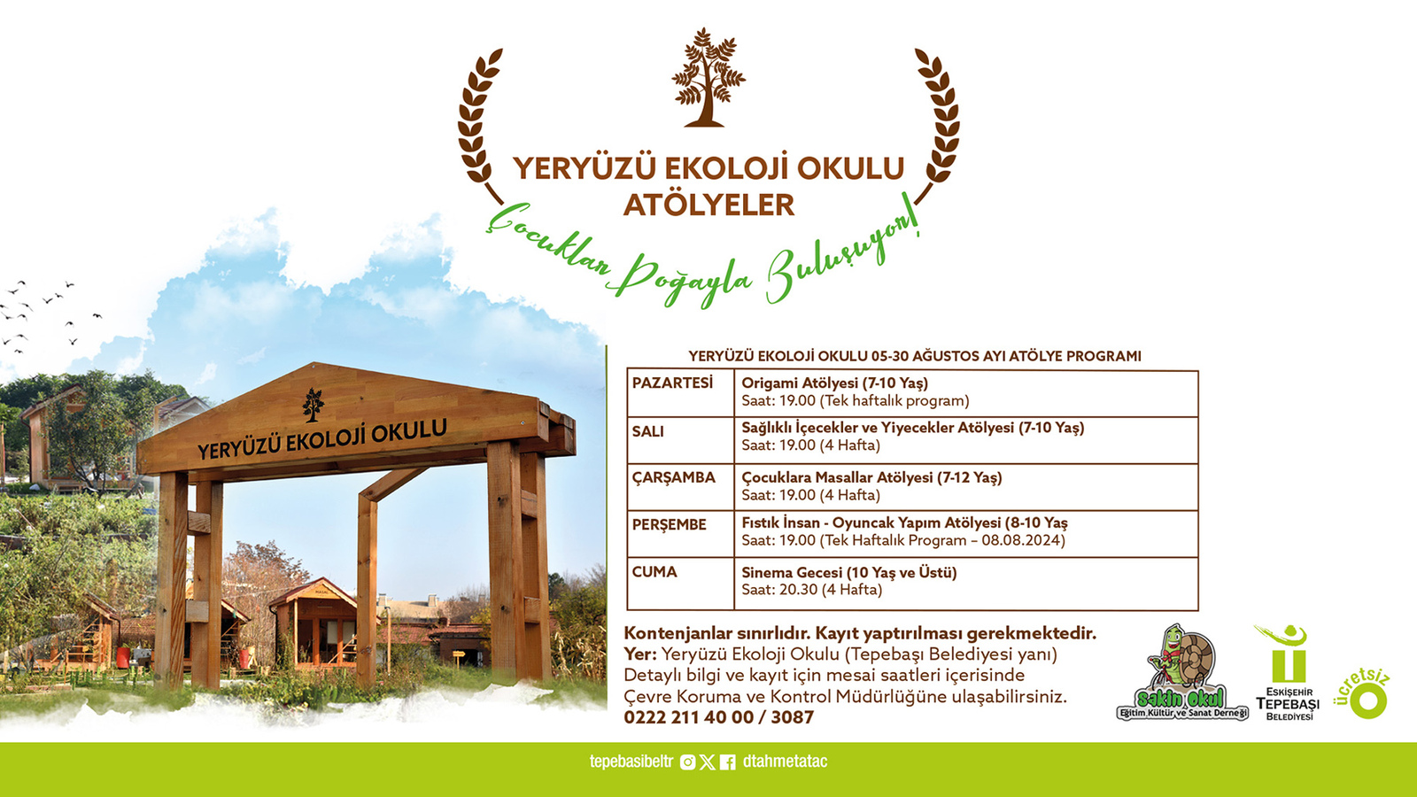 Tepebaşı Belediyesi ile Sakin Okul Eğitim Kültür ve Sanat Derneği iş birliğinde hayata geçirilen Yeryüzü Ekoloji Okulu’nda ücretsiz olarak gerçekleştirilen atölye çalışmaları kapsamında Ağustos ayı programı başlıyor.