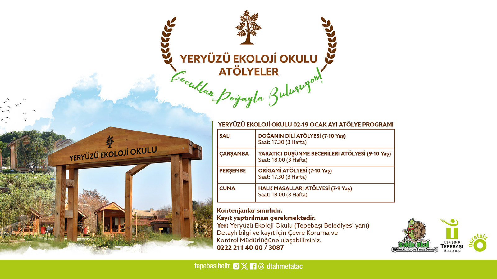 Tepebaşı Belediyesi ile Sakin Okul Eğitim Kültür ve Sanat Derneği iş birliğinde hayata geçirilen Yeryüzü Ekoloji Okulu’nda ücretsiz olarak gerçekleştirilen atölye çalışmaları kapsamında Ocak ayı programı başlıyor.
