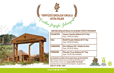 Yeryüzü Ekoloji Okulu’nda 03-28 Şubat tarihleri arasında gerçekleşecek atölye çalışmaları arasında; Yaratıcı yazarlık atölyesi (9-12 yaş), renkli fırçalar atölyesi (8-12 yaş), ebru atölyesi (18 yaş ve üzeri) ve minyatür torna atölyesi (5-7 yaş) yer alıyor.