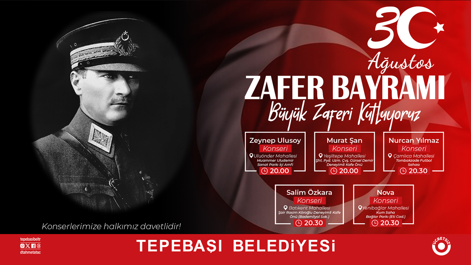 30 Ağustos Zafer Bayramı da belediye tarafından 5 farklı mahallede 5 farklı sanatçı ile düzenlenecek konserler ile kutlanacak. 30 Ağustos Çarşamba günü saat 20.00’de Uluönder Mahallesi Muammer Uludemir Sanat Parkı içi Amfi’de Zeynep Ulusoy, Yeşiltepe Mahallesi Şehit Piyade Çavuş Gürsel Demir Deneyimli Kafe önünde Murat Şan, saat 20.30’da Çamlıca Mahallesi Tombakzade Futbol Sahasında Nurcan Yılmaz, Batıkent Mahallesi Şair Rasim Köroğlu Deneyimli Kafe önünde Salim Özkara ve Yenibağlar Mahallesi Kum Saha Bağlar Parkı’nda ise Nova (Rock Grubu) Eskişehirlilerle buluşacak.