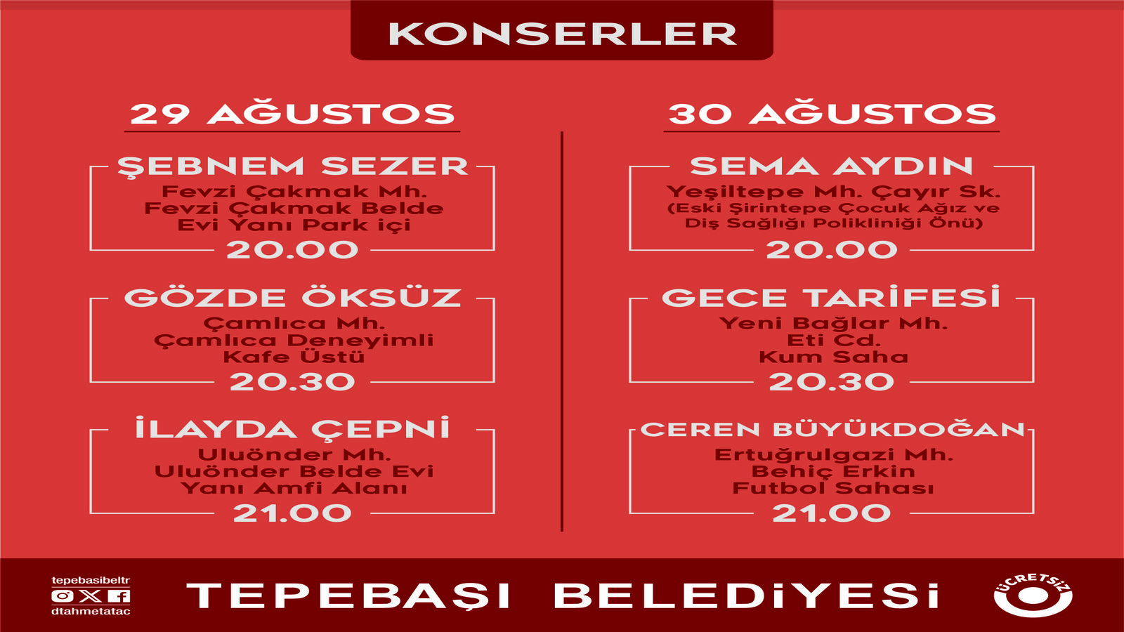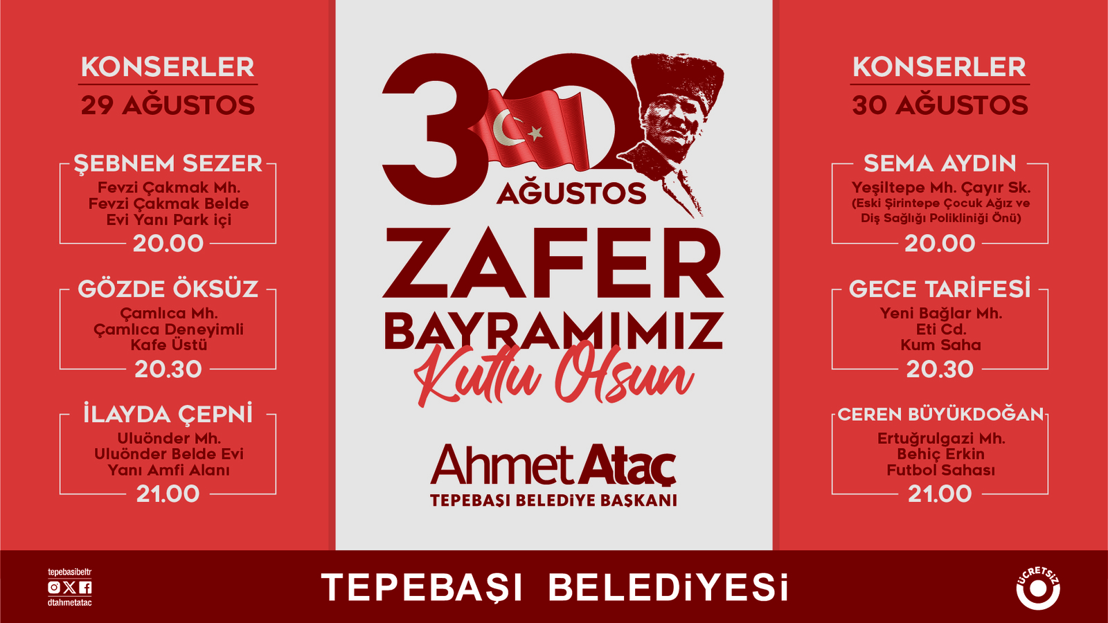 30 Ağustos Zafer Bayramı da belediye tarafından 6 farklı mahallede 6 farklı sanatçı ile düzenlenecek konserler ile kutlanacak. 29 Ağustos Perşembe günü saat 20.00’de Fevzi Çakmak Belde Evi yanında bulunan amfi alanında Şebnem Sezer, saat 20.30’da Çamlıca Deneyimli Kafe’nin üstündeki alanda Gözde Öksüz, saat 21.00’da Uluönder Belde Evi’nin yanındaki amfi alanında İlayda Çepni sahne alacak.