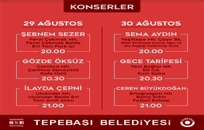 30 Ağustos Cuma günü ise saat 20.00’da Yeşiltepe Mahallesi Çakır Sokak’ta Sema Aydın, saat 20.30’da Yenibağlar Mahallesi kum sahada Gece Tarifesi ve saat 21.00’da Ertuğrulgazi Mahallesi Behiç Erkin Spor Merkezi’nde Ceren Büyükdoğan Eskişehirlilerle buluşacak.