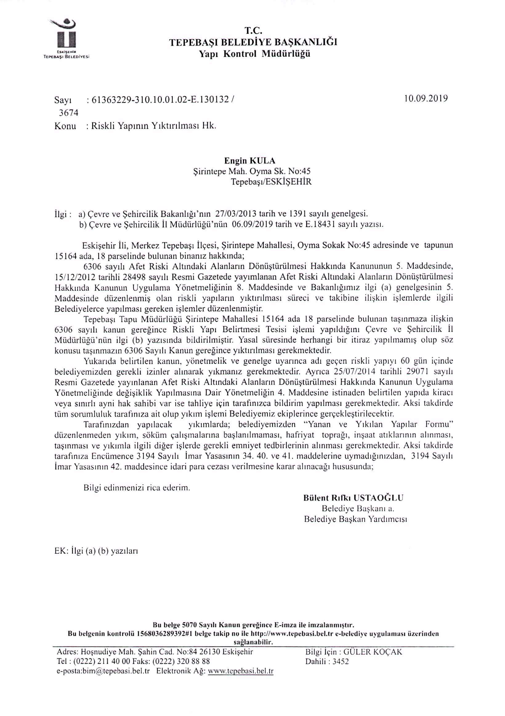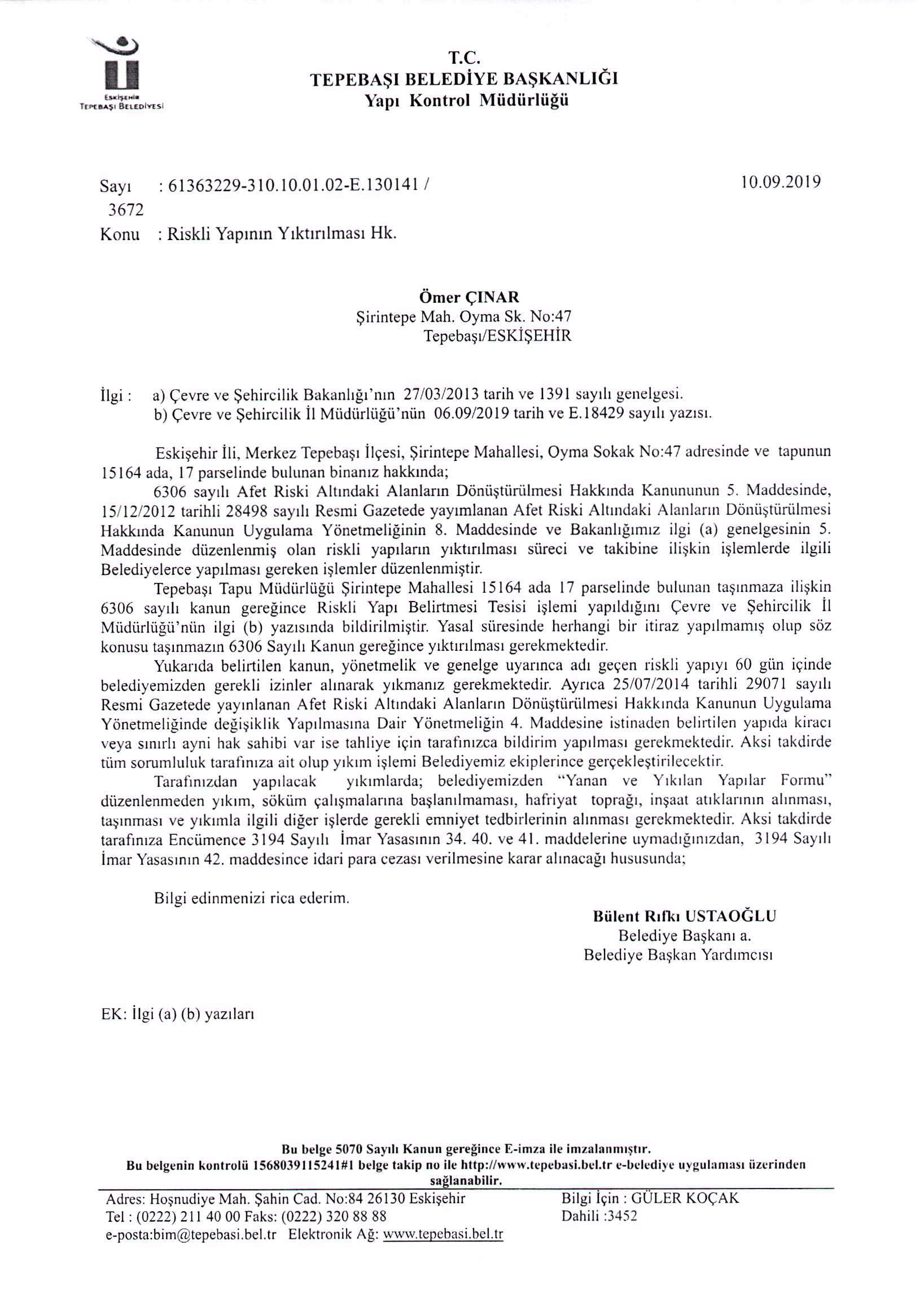 Eskişehir İli, Merkez Tepebaşı İlçesi, Şirintepe Mahallesi, Oyma Sokak No:47 adresinde ve tapunun 15164 ada, 17 parselinde bulunan bina hakkında Çevre ve Şehircilik İl Müdürlüğü’nün 06/09/2019 tarih ve E.18429 sayılı yazısı ile Riskli Yapı olarak belirtme işlemi yapılmış olup 6306 Sayılı Kanunun 5. Maddesine istinaden yapının yıkılması gerektiğinden dolayı ekteki tebliğat varakaları ile 6306 S.K. ve Uygulama Yönetmeliğine göre gerekli yasal işlemin uygulanacağı 7201 S.K. 21. Maddesine göre ilanen tebliğ olunur.